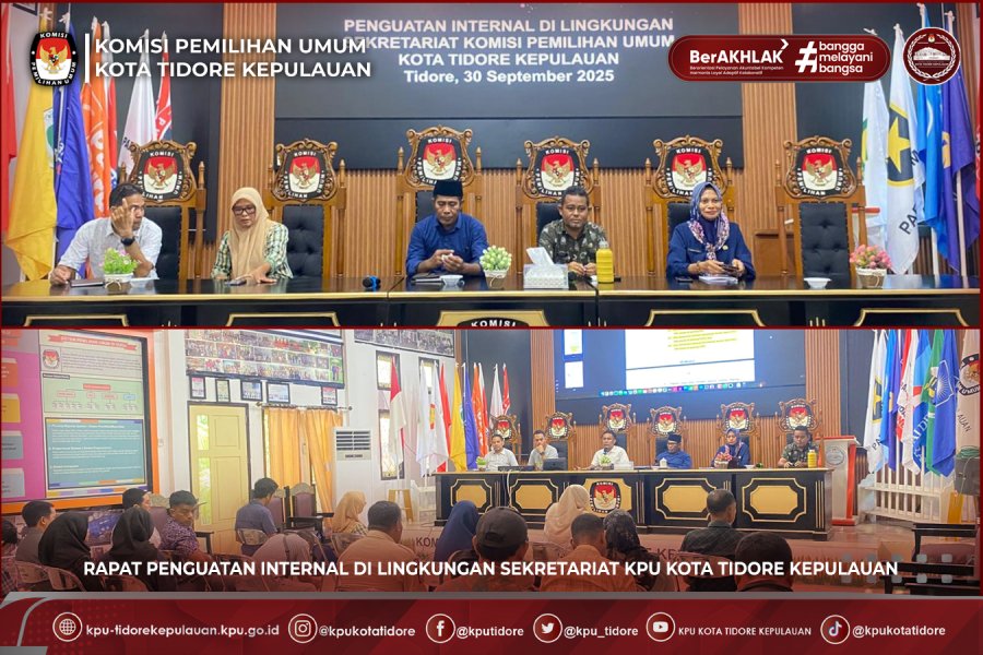 #TemanPemilih, KPU Kota Tidore Kepulauan melaksanakan rapat penguatan internal di lingkungan Sekretariat pada hari Selasa 30/09/2025 di aula rapat KPU Kota Tidore Kepulauan. Rapat dipimpin langsung oleh sekertaris KPU Kota Tidore Kepulauan Akmal Daud didampingi Kepala Sub Bagian Teknis Penyelenggara Pemilu dan Hukum Asman Hi. Muhamad, Kepala Sub Bagian Keuangan, Umum, dan Logistik Syamsul Bakri Mahifa, Kepala Sub Bagian Perencanaan Data dan Informasi Zulfah Badriya, dan Kepala Sub Bagian SDM, Partisipasi dan Hubungan Masyarakat Alwiah M. Saleh serta staf sekretariat KPU Kota Tidore Kepulauan. dalam arahanya Akmal menyampaikan bahwa penguatan kelembagan adalah fondasi utama dalam menjalankan tugas dan fungsi KPU secara efektif dan efisien sehingga KPU harus terus beradaptasi dengan perkembangan dan tantangan zaman yang semakin kompleks. Akmal menambahkan bahwa kegiatan ini momentum penting untuk mengevaluasi diri, mengidentifikasi kekurangan yang perlu ditingkakan, merumuskan strategi yang tepat untuk mencapai tujuan lembaga serta meningkatkan pemahaman tentang tugas dan fungsi masing-masing. pada kesempatan ini para kasubbag juga memberikan arahan yang berkaitan dengan penguatan kelembagaan kali ini.