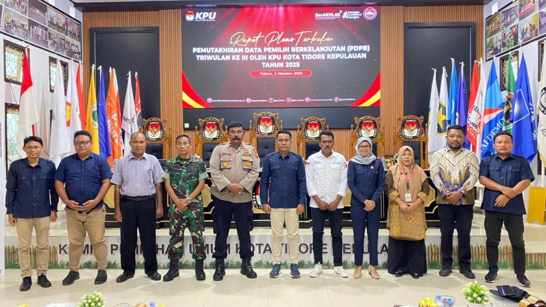 #TemanPemilih, KPU Kota Tidore Kepulauan menyelenggarakan Rapat Pleno terbuka Pemuktahiran Data Pemilih Berkelanjutan (PDPB) triwulan III di aula Rapat KPU Kota Tidore Kepulauan pada Kamis 2 Oktober 2025. Ketua KPU Kota Tidore Kepulauan Randi Ridwan didampingi Anggota Bahrudin Tosofu, Abdulharis Doa, Sudirman Ismail, dan Fitriah Hi. Muhammad, Sekretaris Akmad Daud, Kasubbag Hukum dan SDM Alwia M. Saleh, Kasubbag Perencanaan Data dan Informasi Zulfah Badriyah dan Kasubbag Teknis Sosdiklih dan Parmas Asman Hi. Muhamad dan staf Sekertariat KPU Kota Tidore Kepulauan. Turut hadir Perwakilan Bawaslu Kota Tidore Kepulauan, Perwakilan Polres Kota Tidore Kepulauan, Perwakilan Kodim 1505 Kota Tidore Kepulauan, Dinas Kependudukan dan Pencatatan Sipil, dan Perwakilan Dikjar Provinsi Maluku Utara. Dalam arahannya, Randi menyampaikan rapat pleno Pemuktahiran Data Pemilih Berkelanjutan (PDPB) III merupakan amanat dari Undang-Undang Nomor 7 Tahun 2017 Tentang Pemilu serta aturan turunannya yaitu PKPU Nomor 1 Tahun 2025 bahwa KPU Kabupaten/Kota wajib melaksanakan PDPB setiap 3 Bulan Sekali.