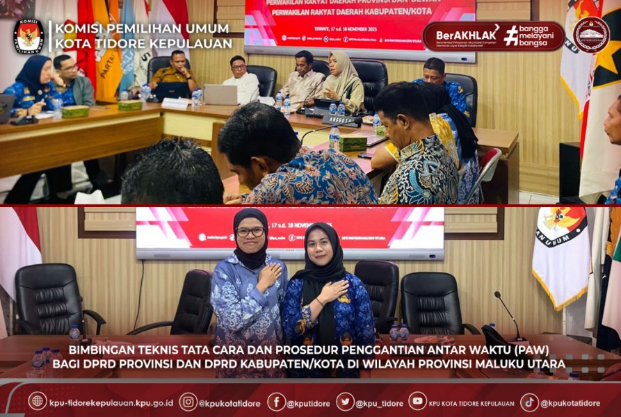 #TemanPemilih, KPU Kota Tidore Kepualaun menghadiri kegiatan Bimbingan Teknis (Bimtek) Tata Cara dan Prosedur Penggantian Antar Waktu (PAW) bagi DPRD Provinsi dan DPRD Kabupaten/Kota di Wilayah Provinsi Maluku Utara, bertempat di Aula Kantor KPU Provinsi Maluku Utara pada Tanggal 17-18 November 2025