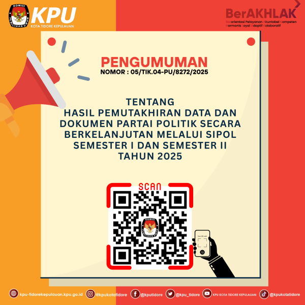 #TemanPemilih, Komisi Pemilihan Umum Kota Tidore Kepulauan mengumumkan hasil pemutakhiran data dan dokumen Partai Politik melalui Sistem Informasi Partai Politik (SIPOL) pada Semester I dan Semester II. Pemutakhiran data ini merupakan bagian dari upaya KPU dalam memastikan keakuratan, keterkinian, serta kelengkapan data partai politik sebagai dasar pelaksanaan tahapan Pemilu sesuai ketentuan peraturan perundang-undangan.