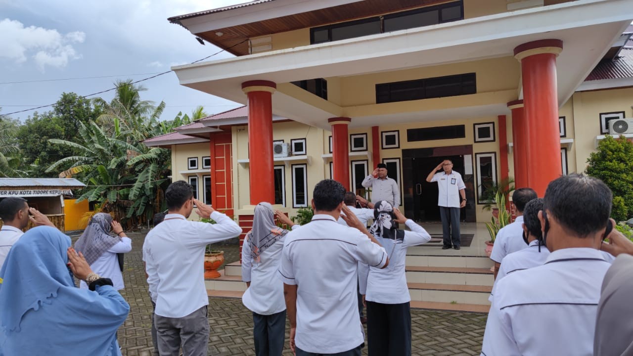 #TemanPemilih. KPU Kota Tidore Kepulauan melaksanakan apel Senin pagi 13/12/2021, bertempat di halaman Kantor. Ketua Divisi Sosdiklih Parmas dan SDM Dr.Abjan Kasim,S.Pd,MAP dalam arahannya sebagai pejabat penerima apel mengharapkan kepada pegawai tetap tingkatkan kualitas sumber daya manusia dan disiplin dalam melaksanakan tugas. Hadir pula Sekretaris KPU Hasyim Sehe,SH dan memberikan arahan kaitannya dengan ketaatan kepada aturan dan keikhlasan dalam menjalankan tugas. Apel diikuti para kasubbag dan staf dan ditutup dengan pembacaan doa dengan harapan semoga Allah SWT senantiasa meridhoi segala aktivitas.