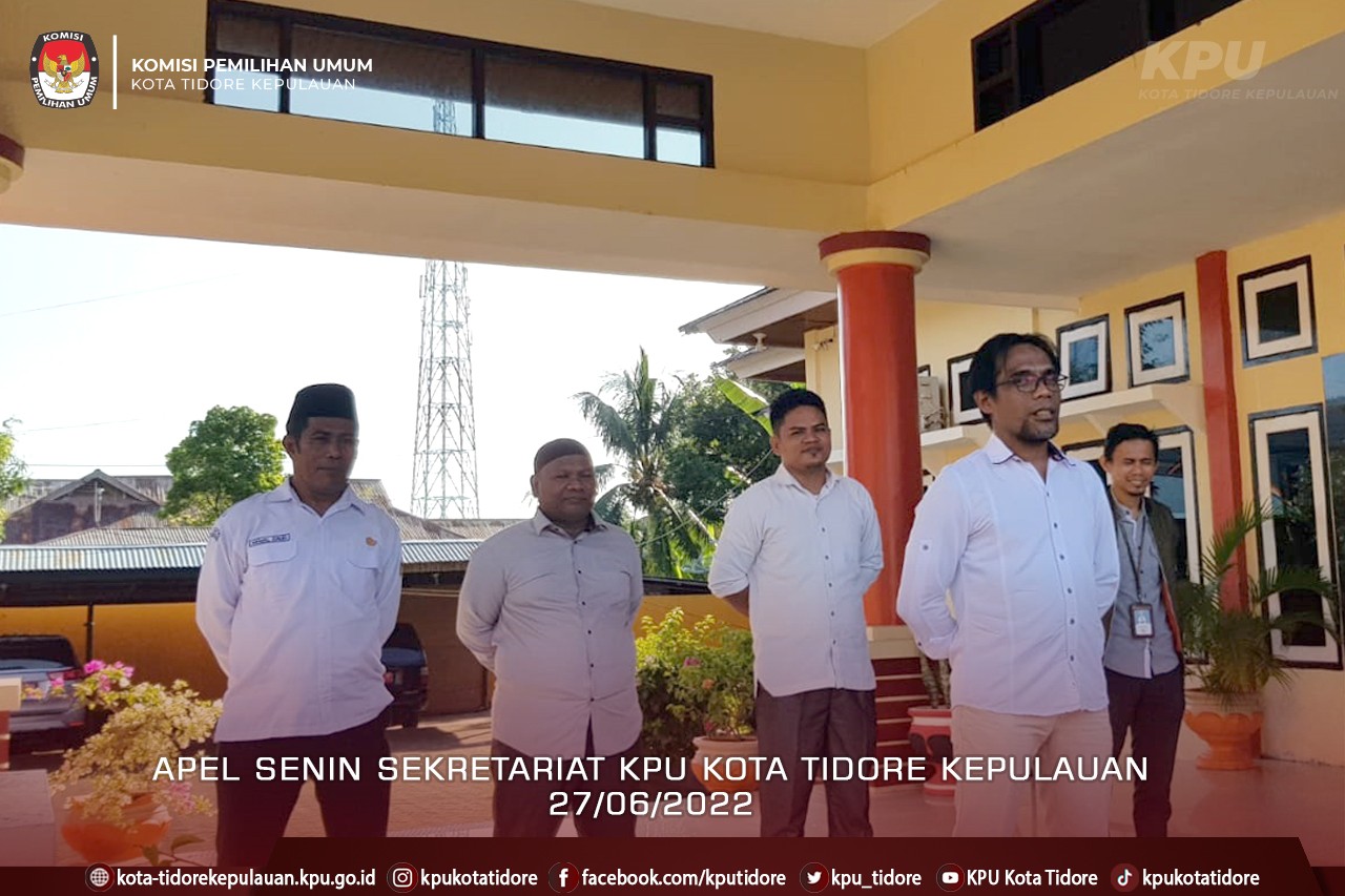 #TemanPemilih, Komisi Pemilihan Umum Kota Tidore Kepulauan, Senin (27/6/2022) melaksanakan apel rutin senin pagi di halaman kantor. Bertindak sebagai pembina apel, Ketua KPU Kota Tidore Kepulauan Abdullah Dahlan, didampingi anggota Abjan Kasim, Abdulharis Doa, dan Amirudin Ais serta Sekretaris Akmal Daud. Dalam arahannya Abdullah menyampaikan pentingya penerapan budaya kerja yang efektif, dengan mengedepankan kerja sama, kebersamaan dan kekompakan dalam pelaksanaan tahapan Pemilu 2024, dan mengharapkan agar pegawai dalam pelaksanaan jadwal piket harus tertib.