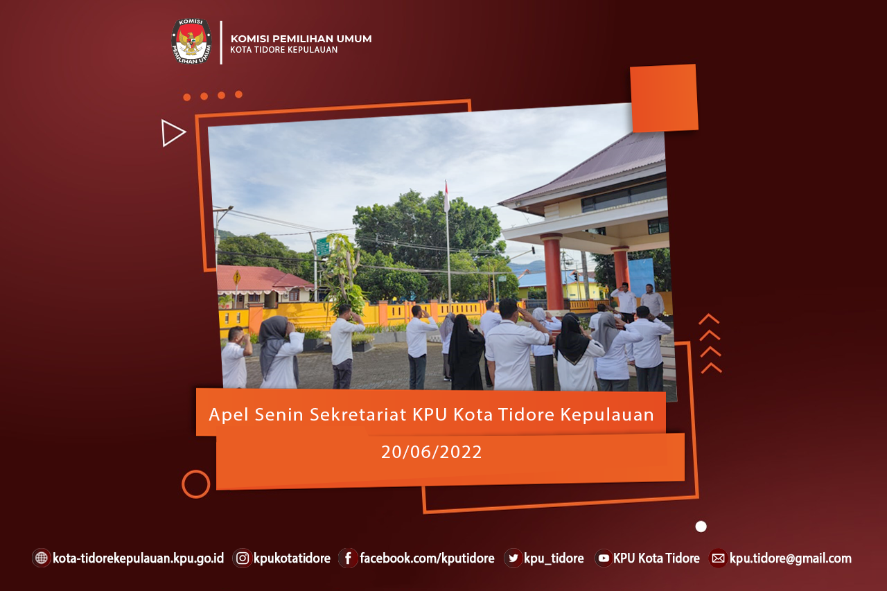 #TemanPemilih! Komisi Pemilihan Umum Kota Tidore Kepulauan, Senin (20/6/2022) melaksanakan apel rutin senin pagi di halaman kantor. Sebagai pembina apel, Anggota KPU Kota Tidore Kepulauan Divisi Sosialisasi, Pendidikan Pemilih, Partisipasi Masyarakat dan SDM Abjan Kasim, didampingi Sekretaris Akmal Daud. Dalam arahannya Abjan Kasim menyampaikan pentingya peningkatan disiplin, kapasitas dan kompetensi serta koordinasi. Turut memberikan arahan Sekretaris Akmal Daud menyampaikan kepada semua ASN agar tidak lalai dalam absensi dan hadir tepat waktu agar menjadi panutan bagi PPNPN, selalu melaporkan kegiatan harian ASN ke dalam buku kendali serta memerintahkan Kasubbag SDM agar menerapkan himbauan Sekjen terhadap Petugas Pengamanan Kantor untuk tetap aktif selam 1 kali 24 jam.