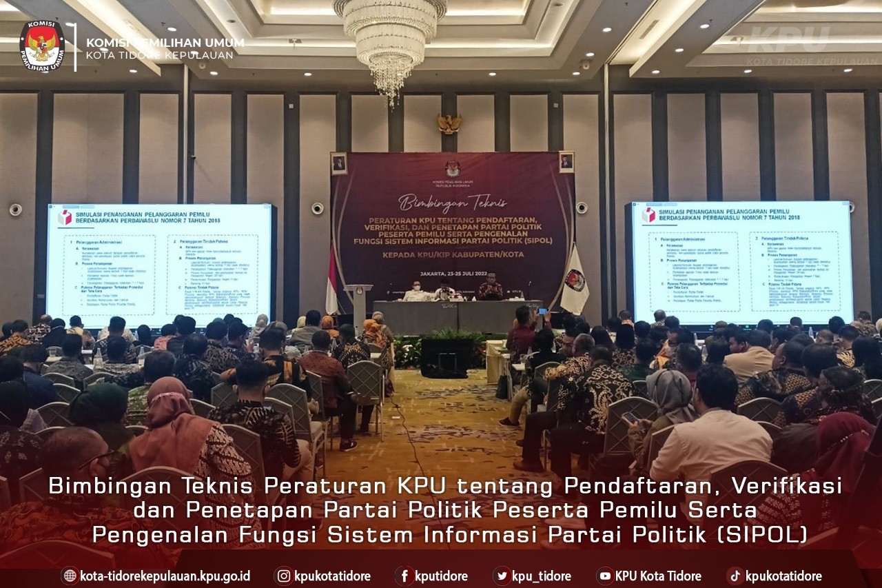 #TemanPemilih, Sabtu (23/07/2022) KPU Kota Tidore Kepulauan mengikuti kegiatan Bimbingan Teknis Peraturan KPU tentang Pendaftaran, Verifikasi dan Penetapan Partai Politik Peserta Pemilu Serta Pengenalan Fungsi Sistem Informasi Partai Politik (SIPOL) Kepada KPU/KIP Kabupaten Kota. Kegiatan Bimtek dibuka oleh Ketua KPU RI Hasyim Asy'ari, didampingi Anggota KPU RI Idham Holik, Parsadan Harahap, Betty Epsilon Idroos, Yulianto Sudrajat, August Mellaz dan Sekretaris Jenderal KPU RI Bernad Dermawan Sutrisno beserta jajarannya.