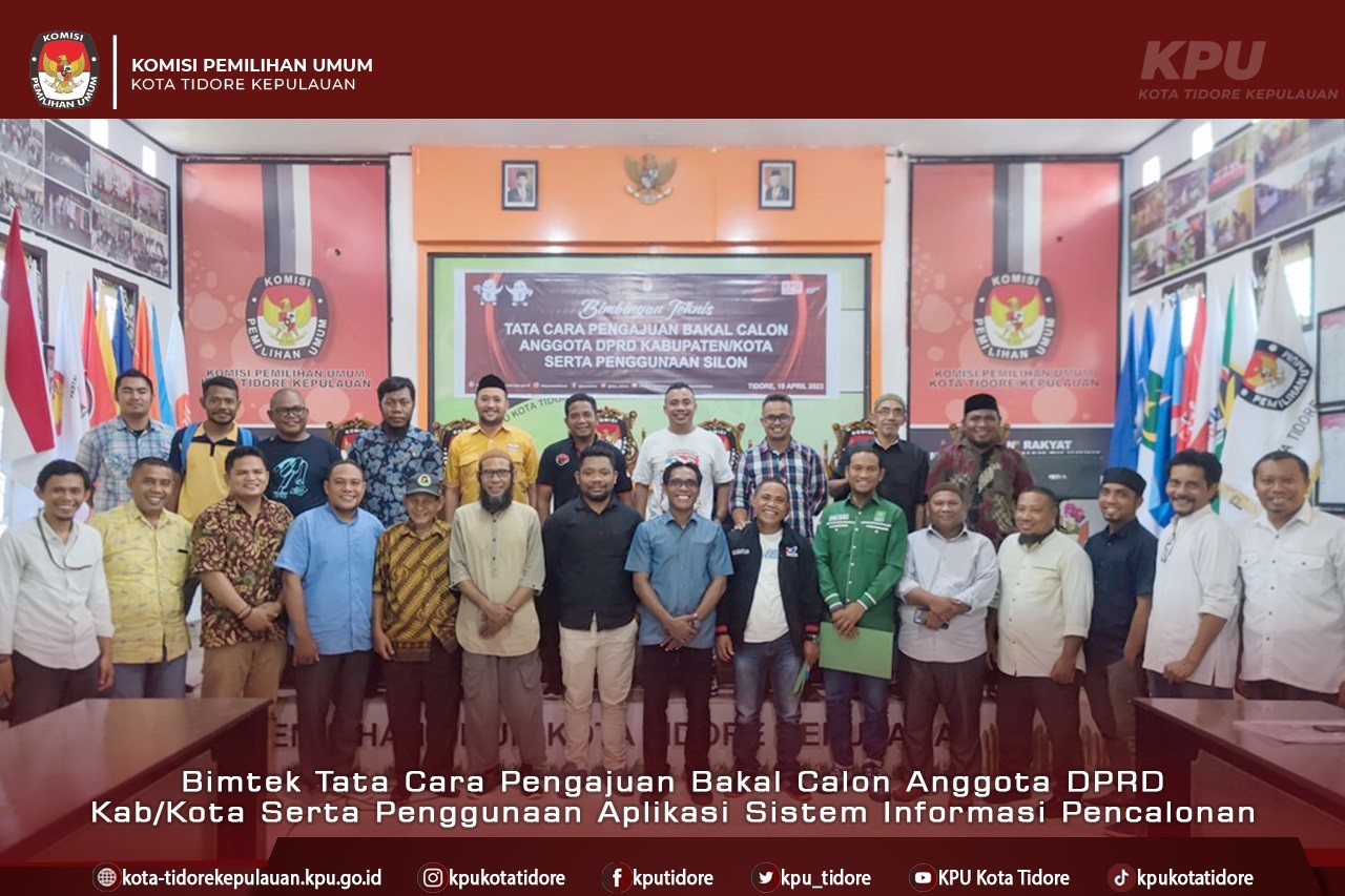 #TemanPemilih, Ketua KPU Kota Tidore Kepulauan (Tikep) Abdullah Dahlan, didampingi anggota, Abdulharis Doa, Abjan Kasim, Amirudin Ais dan Ismail Idris, membuka kegiatan bimbingan teknis (bimtek) tata cara pengajuan bakal calon anggota DPRD kabupaten/kota serta penggunaan aplikasi Sistem Informasi Pencalonan (Silon) bertempat di Aula Kantor KPU Tikep, Rabu (19/4).