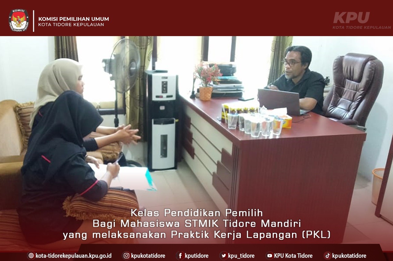 #Temanpemilih, Ketua KPU Kota Tidore Kepulauan Abdullah Dahlan menjadi narasumber pada hari kedua pelaksanaan Kelas Pendidikan Pemilih untuk Mahasiswa STMIK Tidore Mandiri yang melaksanakan Praktik Kerja Lapangan (PKL) di Kantor KPU Kota Tidore Kepulauan, Rabu (27/7/2022). Pada kesempatan ini Abdullah menyampaikan materi tentang Pentingnya Demokrasi, Pemilu dan Pemilihan. Sementara Narasumber kedua hari ini Anggota KPU Kota Tidore Kepulauan Divisi Perencanaan Data dan Informasi Amirudin Ais, di ruang kerjanya menyampaikan materi tentang Perencanaan, Data Pemilih dan Pemutakhiran Data Pemilih Berkelanjutan serta aplikasi mobile Lindungi Hakmu. Kegiatan ini diikuti dengan penuh perhatian oleh 2 mahasiswa PKL dari STMIK Tidore Mandiri Nuraen Tosofu dan Ida Fitriyani.