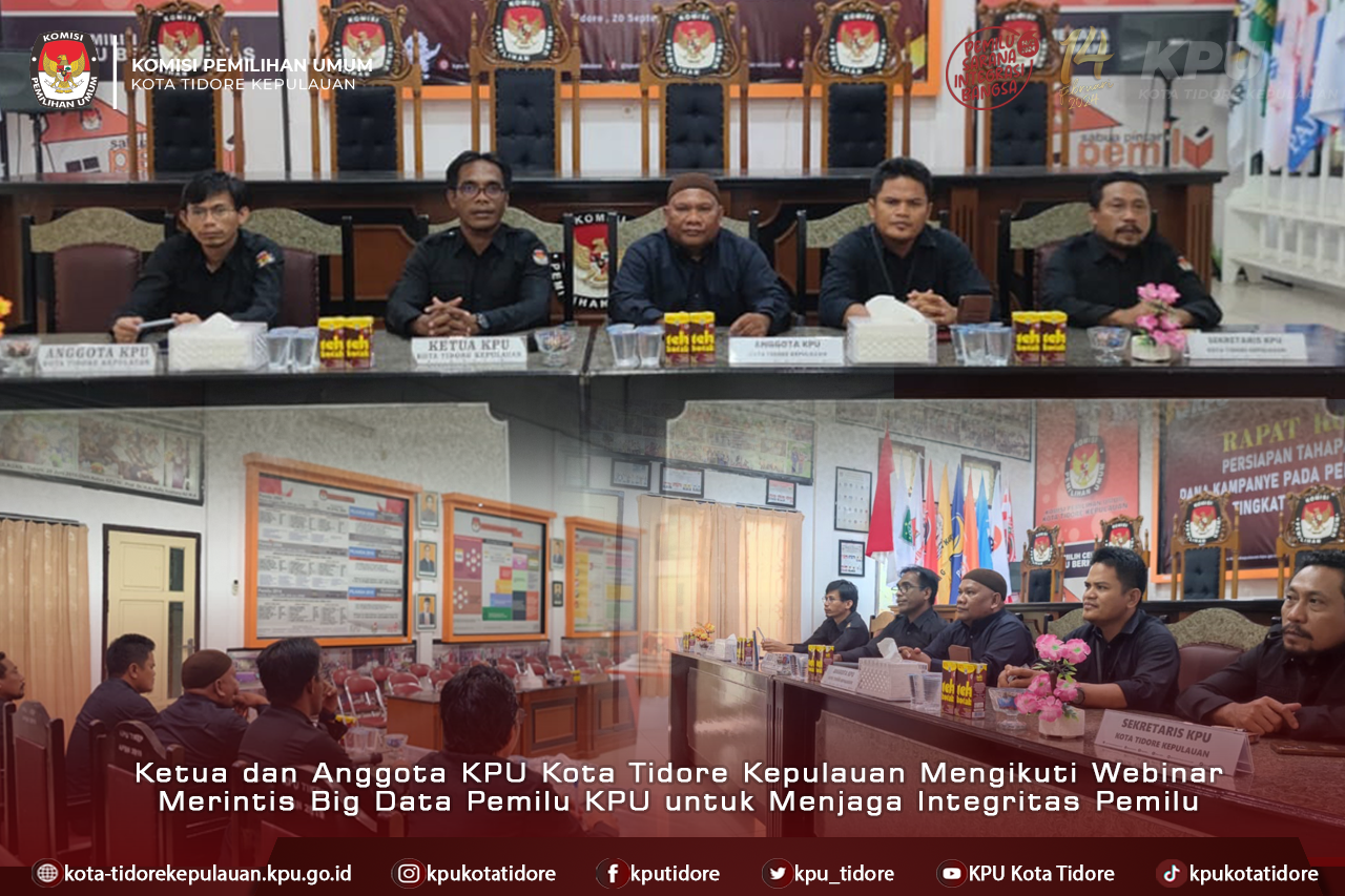 #TemanPemilih, Ketua KPU Tidore Kepulauan, Abdullah Dahlan bersama Anggota, Abjan Kasim, Abdulharis Doa, Amirudin Ais dan Ismail Idris mengikuti kegiatan “Webinar Merintis Big Data Pemilu KPU untuk Menjaga Integritas Pemilu (Webinar Seri Kedua)” yang digelar secara daring oleh KPU RI, Rabu (20/9/2023).