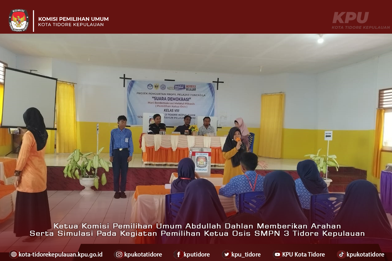 #TemanPemilih, Ketua KPU Kota Tidore Kepulauan (Tikep), Abdullah Dahlan memberikan arahan serta simulasi pada kegiatan Pemilihan Ketua Osis SMPN 3 Tikep, Kamis (31/8).