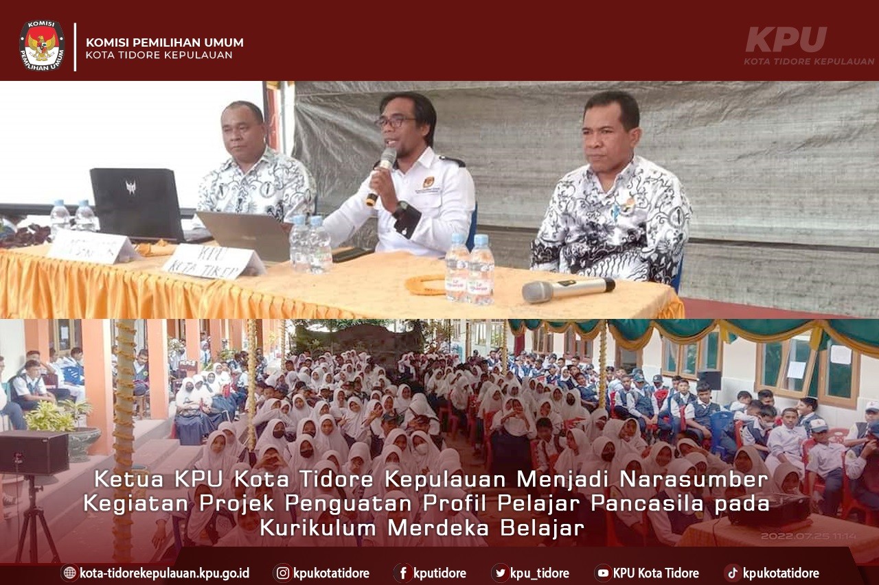 #TemanPemilih, Ketua KPU Kota Tidore Kepulauan Abdullah Dahlan didaulat menjadi narasumber pada kegiatan Projek Penguatan Profil Pelajar Pancasila pada Kurikulum Merdeka Belajar yang dirangkai dengan Pemilihan Pengurus OSIS SMP Negeri 1 Tidore Kepulauan, Senin (25/7/2022). Kegiatan yang mengusung tema "Mari Berdemokrasi Dengan Santun dan Berkualitas" dibuka oleh Kepala SMPN 1 Tidore Kepulauan Muriyono Hamid, bertempat di halaman sekolah dan diikuti oleh ratusan peserta siswa-siswi kelas VIII & IX.