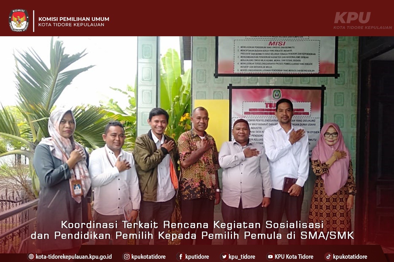 #TemanPemilih, Dalam menghadapi tahapan Pemilu 2024, KPU Kota Tidore Kepulauan melakukan kunjungan ke sejumlah instansi terkait guna melakukan koordinasi, dan pada kamis (7/7/2022) mengunjungi Dinas Pendidikan dan Kebudayaan Provinsi Maluku Utara Cabang Dinas Pendidikan Kota Tidore Kepulauan. Dalam kunjungan ini Anggota KPU Kota Tidore Kepulauan Abjan kasim dan Abdulharis Doa didampingi Kasubbag Umum Keuangan dan Logistik Samsul Bakri Mahifa, Kasubbag Teknis Penyelenggaraan Asman Hi. Muhammad dan Kasubbag Hukum dan SDM Alwia M. Saleh dan diterima oleh staf Cabang Dinas Pendidikan Samsudin Bajang. Dalam kegiatan ini KPU Kota Tidore Kepulauan berkoordinasi terkait rencana sejumlah kegiatan sosialisasi dan pendidikan pemilih kepada pemilih pemula di SMA/SMK serta aktivitas Bakohumas KPU Kota Tidore Kepulauan.