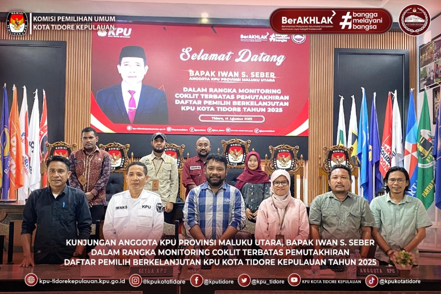 #TemanPemilih, KPU Kota Tidore Kepulauan melaksanakan Pencocokan dan Penilitaian (coklit) Terbatas (coktas) di kelurahan Tuguwaji Kecamatan Tidore pada Kamis (14/08/2025). Pelaksanaan Coklit Terbatas (Coktas) dipimpin langsung Ketua KPU Kota Tidore Kepulauan Randi Ridwan dengan didampingi Anggota Bahrudin Tosofu, Abdulharis Doa, Sudirman Ismail, dan Fitriah Hi. Muhammad, dan Staf Sekretariat KPU Kota Tidore Kepulauan. pelaksanan Coklit terbatas (Coktas) juga dimonitoring langsung oleh anggota KPU Provinsi Maluku Utara Iwan Seber dan juga Anggota Bawaslu Kota Tidore Kepulauan Supriyanto Ade. Iwan dalam arahannya menyampaikan coklit terbatas bisa terjadi dalam beberapa konteks, misalnya Pemilih baru yang belum tercatat saat coklit utama dilakukan, pemilih pindahan atau pemilih yang berubah status domisili, perbaikan data akibat temuan dilapangan atau laporan masyarakat. Iwan Menambahkan tujuan Coklit Terbatas (Coktas) kali ini yaitu 1. Memastikan seluruh pemilih yang memenuhi syarat tercatat dalam daftar pemilih, 2. Memperbaiki atau memperbarui data yang belum akurat, serta menjamin prinsip "satu orang satu suara" tetap terlaksana dengan baik.