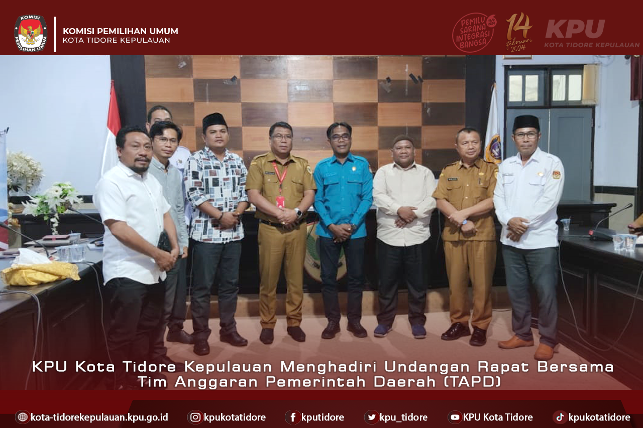 #Temanpemilih, Ketua KPU Kota Tidore Kepulauan, Abdullah Dahlan didampingi Anggota, Abjan Kasim, Amirudin Ais, Abdulharis Doa dan Ismail Idris serta Sekretaris, Akmal Daud bersama Kasubbag dan Bendahara menghadiri undangan rapat dari Pemerintah Kota Tidore Kepulauan di ruang rapat Kantor Walikota Tidore Kepulauan, Senin (2/10/2023).