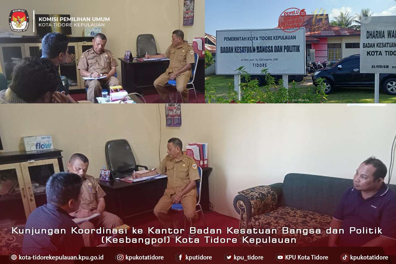 #TemanPemilih, Anggota KPU Kota Tidore Kepulauan, Amirudin Ais dan Ismail Idris serta Sekretaris, Akmal Daud melakukan kunjungan koordinasi ke Kantor Badan Kesatuan Bangsa dan Politik (Kesbangpol) Kota Tidore Kepulauan, Selasa (26/9/2023).