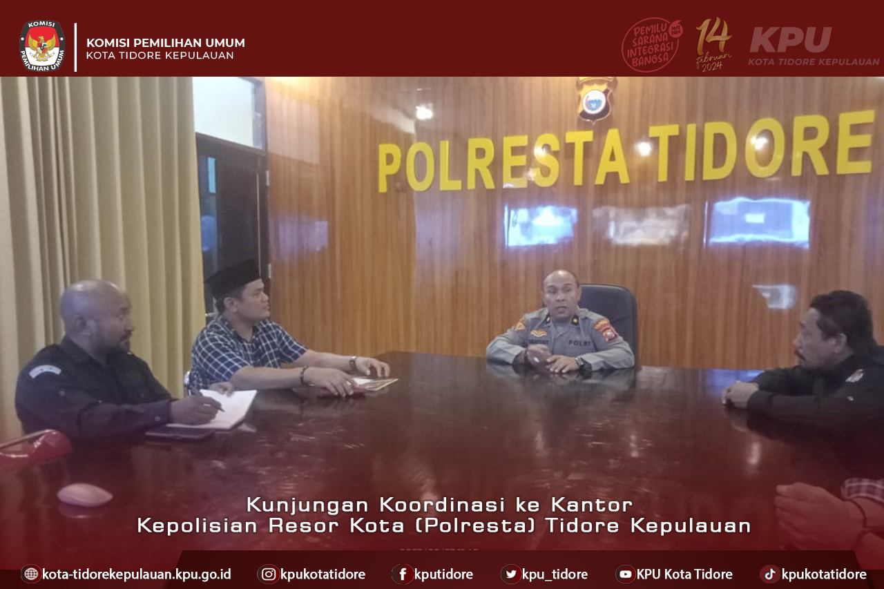 #TemanPemilih, Anggota KPU Kota Tidore Kepulauan, Amirudin Ais dan Ismail Idris serta Admin Sistem Informasi Data Pemilih (Sidalih), Husain Sawal melakukan kunjungan koordinasi ke Kantor Kepolisian Resor Kota (Polresta) Tidore Kepulauan, Rabu (27/9/2023).
