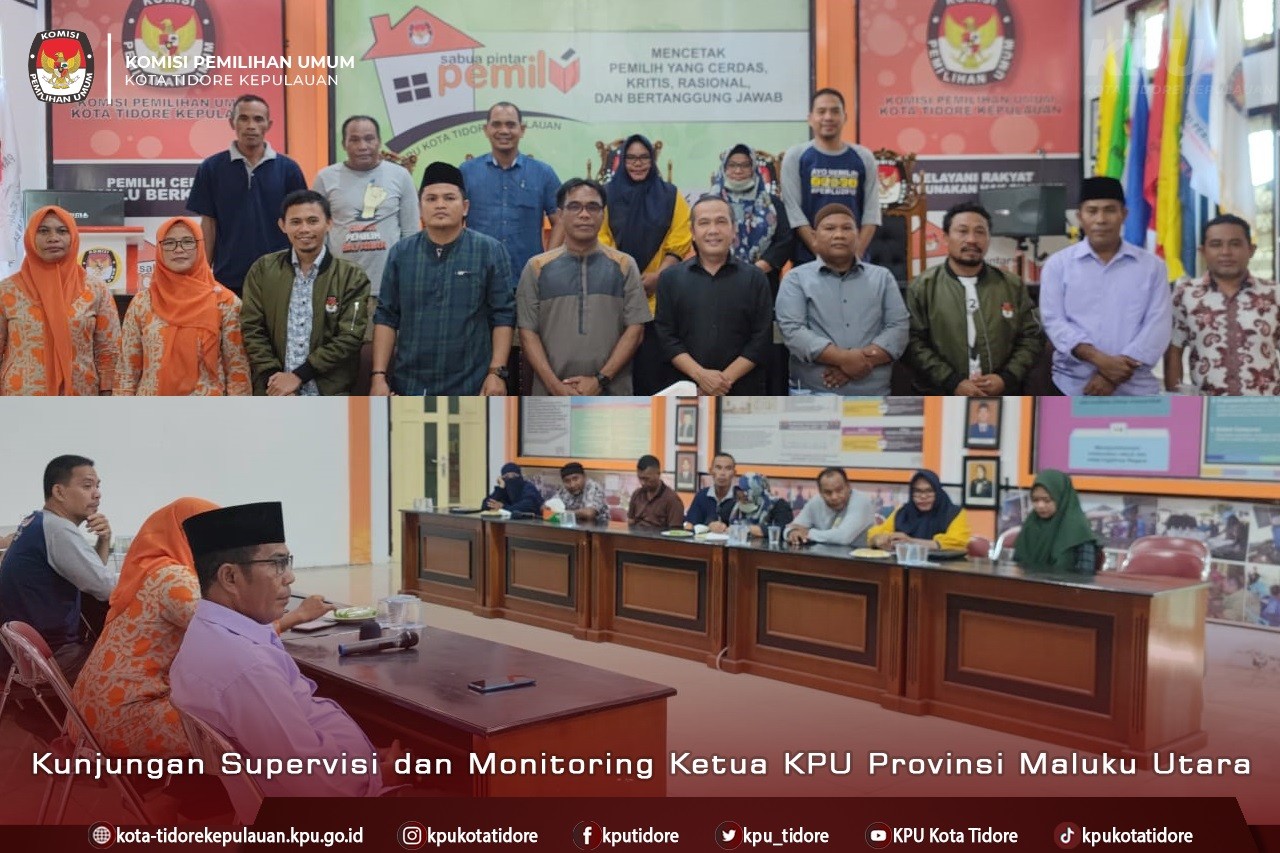 #TemanPemilih, Jumat (02/9), KPU Kota Tidore Kepulauan menerima kunjungan supervisi dan monitoring Ketua KPU Provinsi Maluku Utara (Malut) Pudja Sutamat, didampingi Kepala Subbagian Data dan Informasi Sekretariat KPU Malut, Iip Jaya Apriansyah.