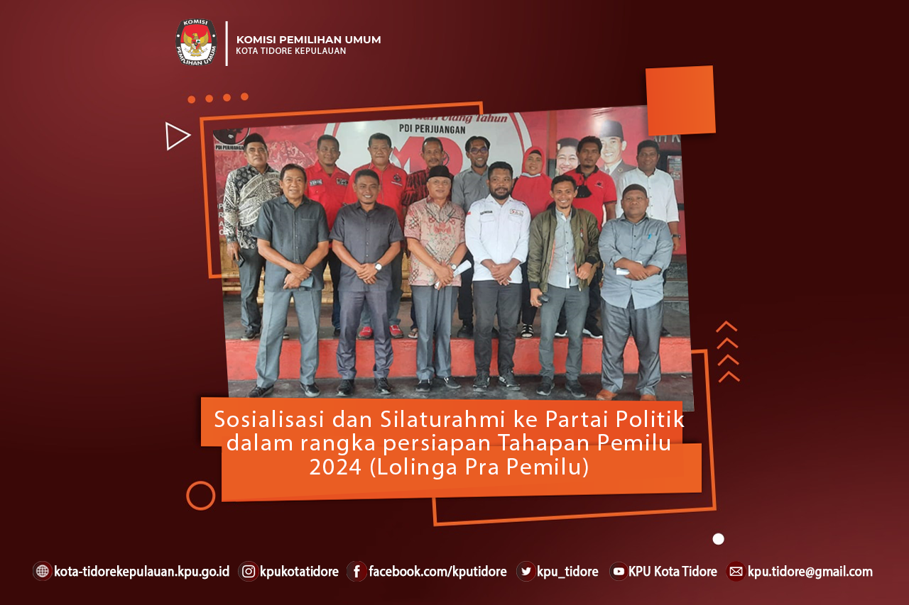 Kegiatan "Lolinga Pra Pemilu 2024" hari keempat, Rabu (11/5), KPU Kota Tidore Kepulauan bersama Bawaslu Kota Tidore Kepulauan mengunjungi Sekretariat DPC Partai Demokrasi Indonesia Perjuangan (PDIP) Kota Tidore Kepulauan yang beralamat di Kecamatan Tidore. Kegiatan Lolinga ini dimaknai sebagai berjalan keliling atau kunjungan silaturahmi dan sosialisasi ke sekretariat partai-partai politik di Kota Tidore Kepulauan.