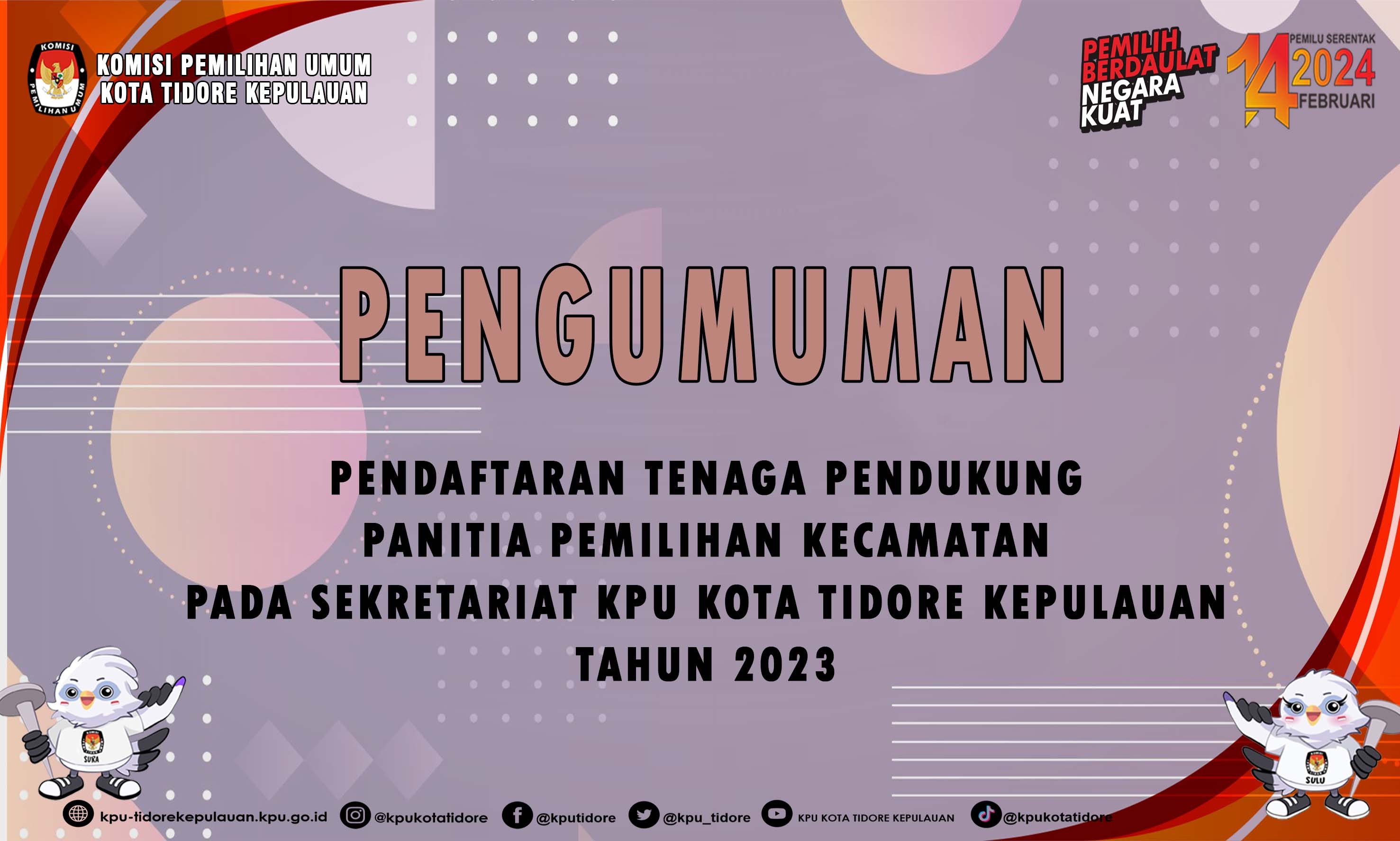Sekretaris Komisi Pemilihan Umum Kota Tidore Kepulauan, memberi kesempatan kepada putra-putri terbaik bangsa untuk menjadi tenaga pendukung Sekretariat Panitia Pemilihan Kecamatan pada Sekretariat Komisi Pemilihan Umum Kota Tidore Kepulauan Tahun Anggaran 2023 dengan ketentuan sebagai berikut.