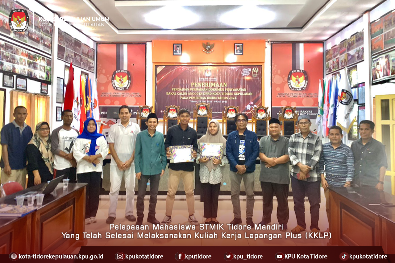 #TemanPemilih, Ketua KPU Kota Tidore Kepulauan, Abdullah Dahlan didampingi Anggota, Abjan Kasim dan Abdulharis Doa serta Sekretaris, Akmal Daud dan Kasubag KUL, Samsul Bakri Mahifa serta Kasubag Teknis Penyelenggara, Asman H. Muhammad melaksanakan pelepasan terhadap dua Mahasiswa STMIK Tidore Mandiri yang telah selesai melaksanakan Kuliah Kerja Lapangan Plus (KKLP) di Kantor KPU Kota Tidore Kepulauan' Jumat (11/8).