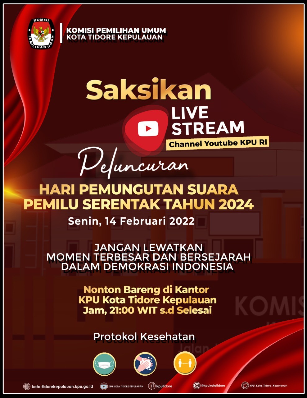 Sehubungan dengan telah ditetapkannya Keputusan Komisi Pemilihan Umum Republik Indonesia Nomor 21 Tahun 2022 tentang Hari dan Tanggal Pemungutan Suara pada Pemilihan Umum Presiden dan Wakil Presiden, anggota Dewan Perwakilan Rakyat, anggota Dewan Perwakilan Daerah, anggota Dewan Perwakilan Rakyat Daerah Provinsi, dan anggota Dewan Perwakilan Rakyat Daerah Kabupaten/Kota Serentak Tahun 2024. Maka dari itu KPU Kota Tidore Kepulauan melalui kanal Youtube KPU RI mengajak masyarakat Kota Tidore Kepulauan dan sekitarnya untuk turut menyaksikan momen terbesar dan bersejarah dalam demokrasi Indonesia, yaitu peluncuran Hari Pemungutan Suara Serentak Tahun 2024 pada hari Senin 14 Februari 2022.