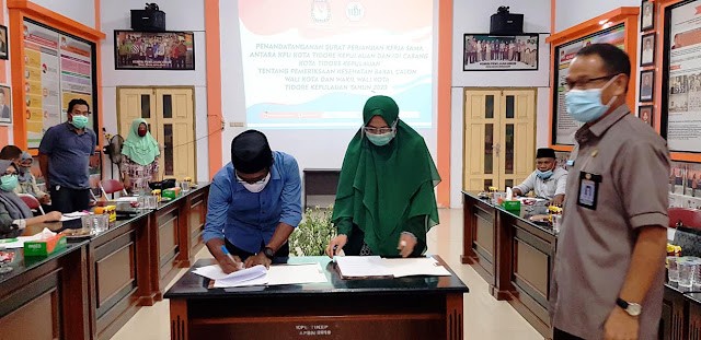 Penandatanganan Surat Perjanjian Kerja Sama antara Komisi Pemilihan Umum Kota Tidore Kepulauan dan Ikatan Dokter Indonesia Cabang Kota Tidore Kepulauan di aula KPU Kota Tidore Kepulauan, Rabu, 26 Agustus 2020.