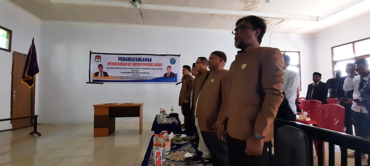 #TemanPemilih. Komisi Pemilihan Umum Kota Tidore Kepulauan (KPU Tikep) dan Universitas Bumi Hijrah Tidore melaksanakan penandatanganan MoU pada Rabu 10 November 2021 bertepatan dengan Pelantikan Rektor Universitas Bumi Hijrah Tidore dan Hari Pahlawan, bertempat di aula Universitas Bumi Hijrah. Penandatanganan MoU yang berisi tentang "Kerjasama Tri Dharma Perguruan Tinggi melalui Program Sosialisasi dan Pendidikan Pemilih” dilakukan oleh Abdullah Dahlan selaku Ketua KPU Tikep dan Rektor Universitas Bumi Hijrah, Sarbaini A. Karim, SKM.,M.Kes