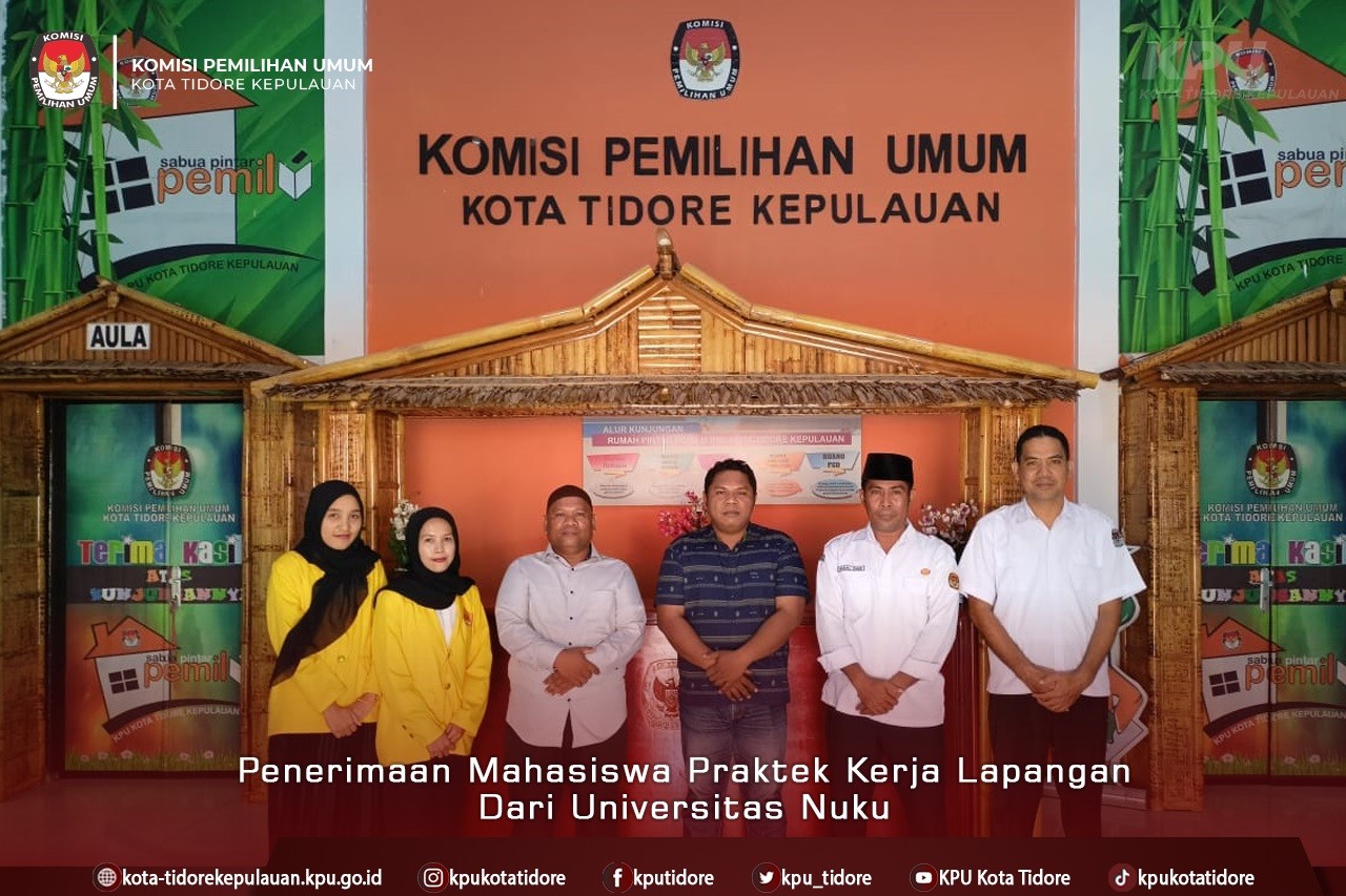 #TemanPemilih, KPU Kota Tidore Kepulauan menerima kehadiran 2 mahasiswa Universitas Nuku (UNNU) Tidore dalam rangka melaksanakan Praktik Kerja Lapangan (PKL) di Kantor KPU Kota Tidore Kepulauan, didampingi Dosen UNNU Tidore Ilfan Baharuddin, Senin (1/8/2022). Kehadiran mereka diterima langsung oleh Ketua KPU Kota Tidore Kepulauan Abdullah Dahlan dan Abjan Kasim (Ketua Divisi Sosialisasi, Pendidikan Pemilih, Partisipasi masyarakat dan SDM), Sekretaris Akmal Daud serta Samsul Bakri Mahifa (Kasubag Keuangan Umum dan Logistik)