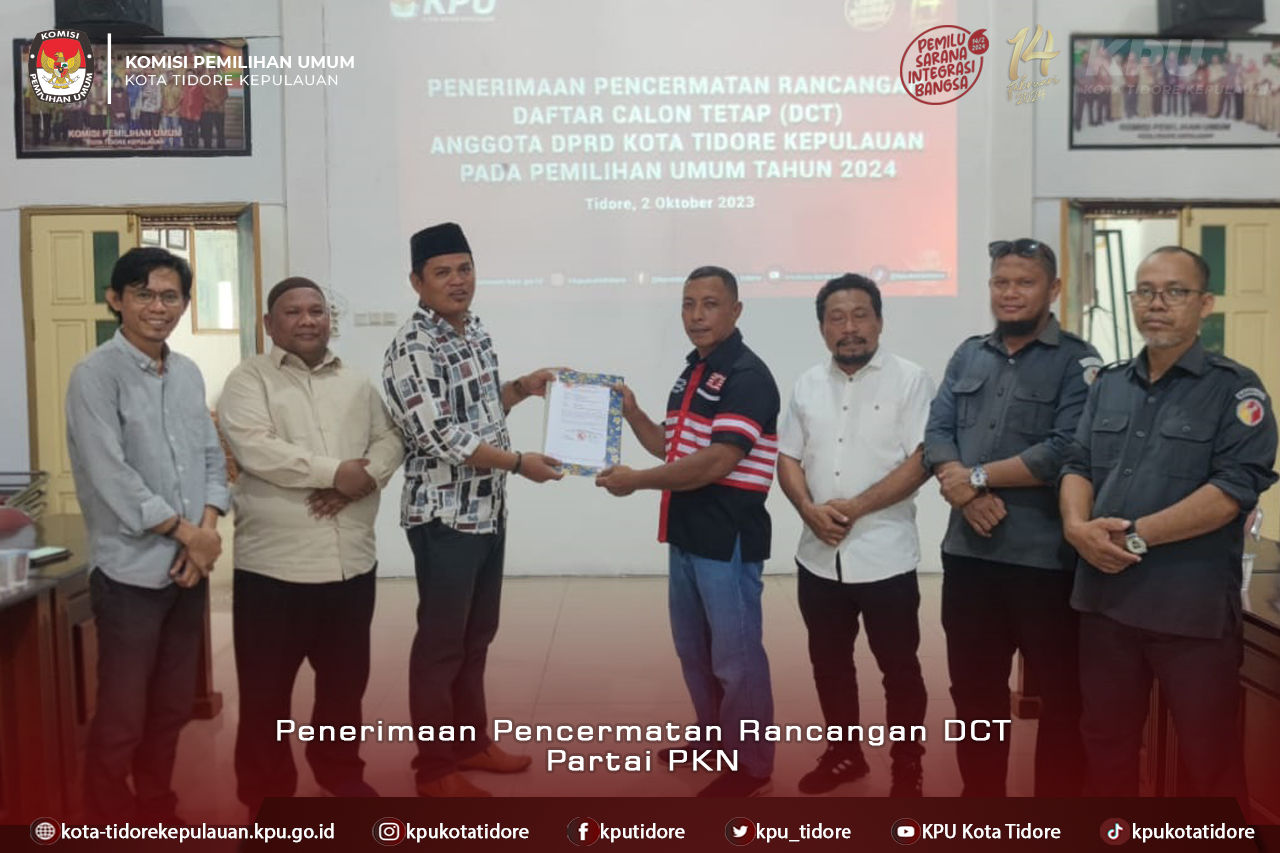 Delegasi partai diterima oleh Anggota KPU Kota Tidore Kepulauan Amirudin Ais, didampingi Anggota, Abdulharis Doa dan Abjan Kasim, serta Anggota Bawaslu Kota Tidore Kepulauan di aula Kantor KPU Kota Tidore Kepulauan.