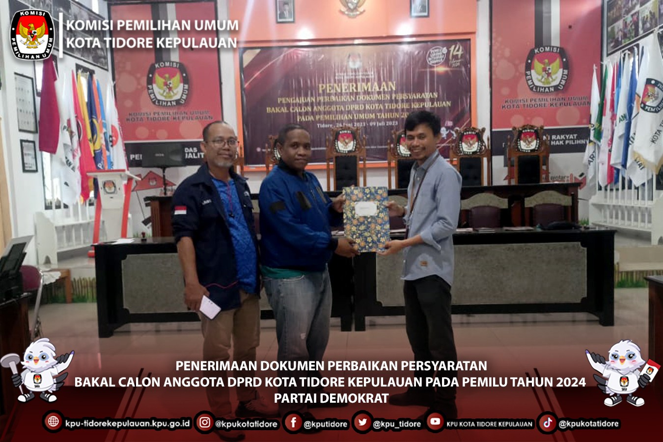 #TemanPemilih, Partai Demokrat mengajukan Penggantian Dokumen Perbaikan Persyaratan Bakal Calon Anggota DPRD Kota Tidore Kepulauan pada Pemilu Tahun 2024, Minggu (17/7) di Kantor KPU Kota Tidore Kepulauan. Partai Demokrat merupakan partai ke-6 yang mengajukan penggantian dokumen. Pengajuan dilakukan oleh operato/petugas penghubung partai.