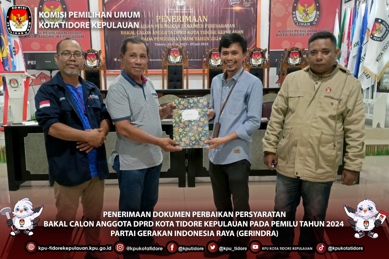 #TemanPemilih, Partai Gerakan Indonesia Raya (Gerindra) mengajukan Penggantian Dokumen Perbaikan Persyaratan Bakal Calon Anggota DPRD Kota Tidore Kepulauan pada Pemilu Tahun 2024, Minggu (17/7) di Kantor KPU Kota Tidore Kepulauan. Partai Gerindra merupakan partai ke-7 yang mengajukan penggantian dokumen. Pengajuan dilakukan oleh Ketua Partai Gerindra Kota Tikep didampingi sekretaris dan bakal calon anggora DPRD.