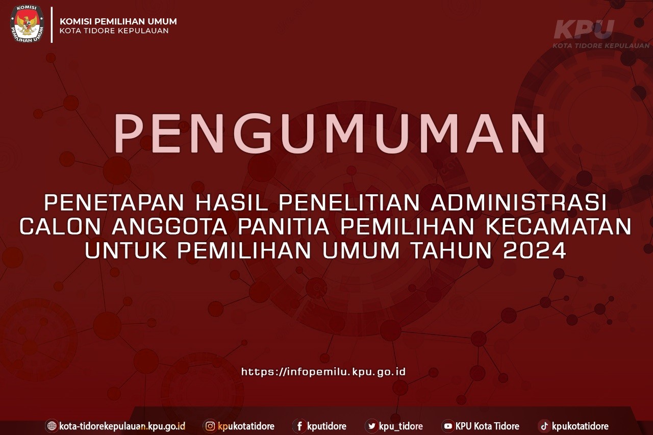 Berdasarkan Berita Acara Rapat Pleno KPU Kota Tidore Kepulauan Nomor 29/PP.04.1-BA/8272/2022 tanggal 4 Desember 2022 tentang Rapat Pleno Penetapan Hasil Penelitian Administrasi Calon Anggota Panitia Pemilihan Kecamatan pada Pemilihan Umum Tahun 2024, disampaikan hal-hal sebagai berikut: