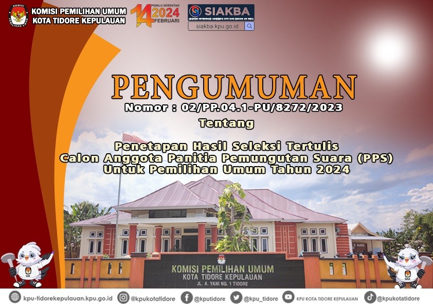 Berdasarkan Berita Acara Rapat Pleno KPU Kota Tidore Kepulauan Nomor 02/PP.04.1-BA/8272/2023 tanggal 14 Januari 2023 tentang Penetapan Hasil Seleksi Tertulis Calon Anggota Panitia Pemungutan Suara (PPS) untuk Pemilihan Umum Tahun 2024, disampaikan hal-hal sebagai berikut: