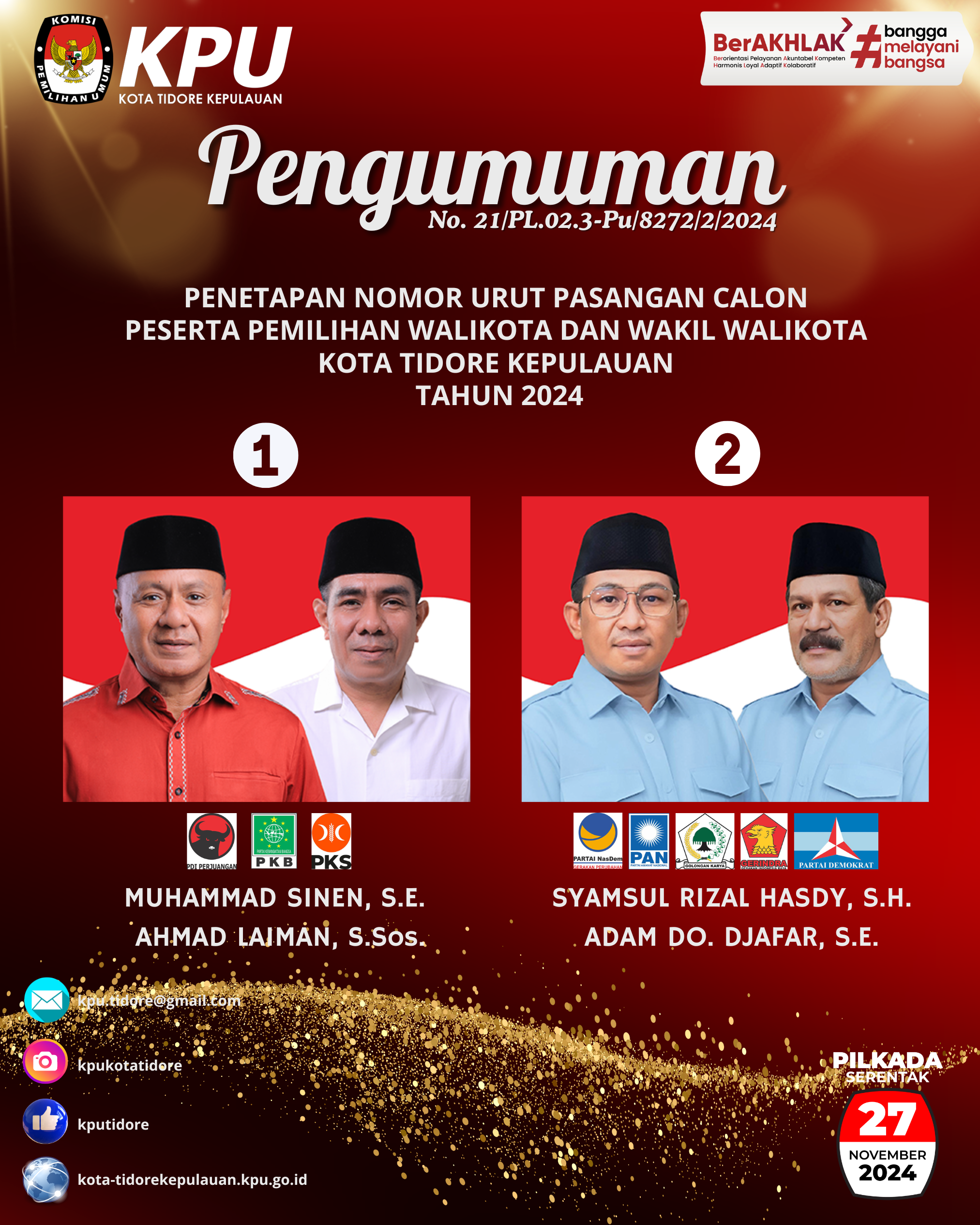PENGUMUMAN PENETAPAN NOMOR URUT PASANGAN CALON PESERTA PEMILIHAN WALIKOTA DAN WAKIL WALIKOTA TIDORE KEPULAUAN TAHUN 2024