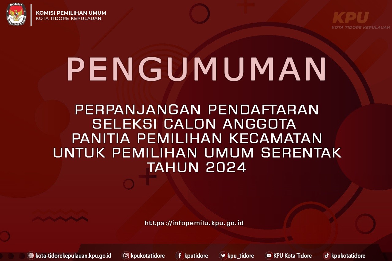 Sehubungan dengan hal tersebut, KPU Kota Tidore Kepulauan, membuka perpanjangan waktu pendaftaran seleksi calon anggota Panitia Pemilihan Kecamatan pada kecamatan sebagai berikut :