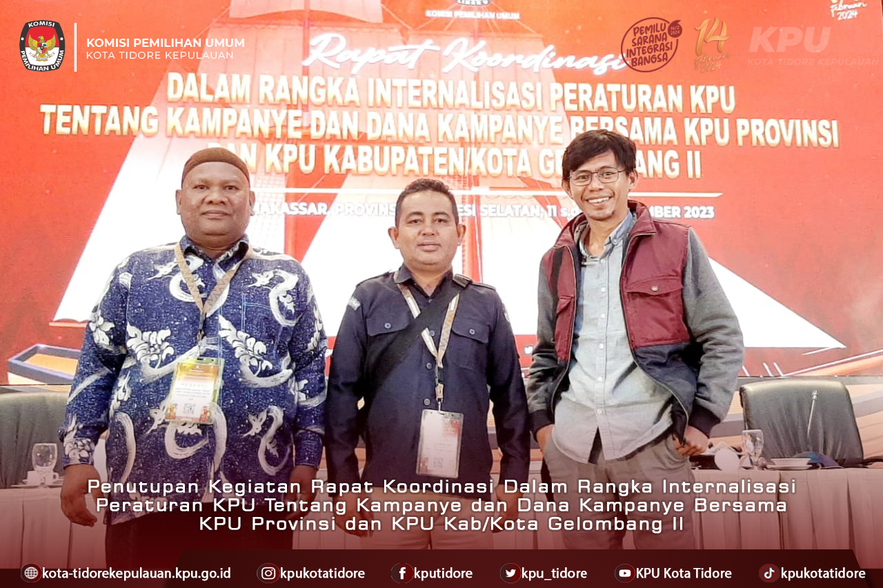 #TemanPemilih, Anggota KPU Kota Tidore Kepulauan, Abjan Kasim dan Abdulharis Doa serta Kasubbag Teknis Penyelenggara dan Hupmas, Asman H. Muhammad mengikuti acara penutupan kegiatan Rapat Koordinasi Dalam Rangka Internalisasi Peraturan KPU Tentang Kampanye dan Dana Kampanye Bersama KPU Provinsi dan KPU Kabupaten/Kota Gelombang II, di Makassar, Selasa (12/9/2023).