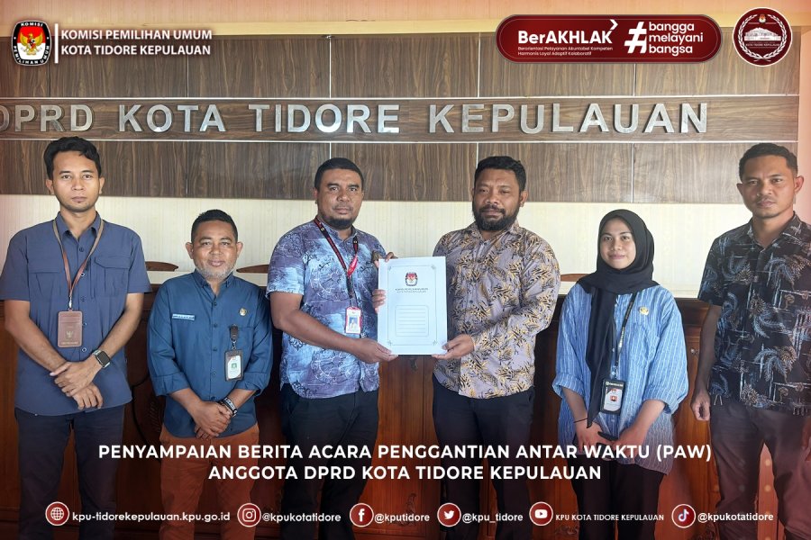 #TemanPemilih, Anggota KPU Kota Tidore Kepulauan Bahrudin Tosofu didampingi kasubbag Teknis Penyelengaran Pemilu dan Hukum Asman Hi. Muhamad serta Staf Sekretariat KPU Kota Tidore Kepulauan menyampaikan berita acara hasil pleno penggantian antarwaktu (PAW) ke Sekretariat DPRD Kota Tidore Kepulauan, diterima oleh kabag persidangan sekwan Sofyan A. Husain di gedung DPRD Kota Tidore Kepulauan pada pukul 15.00 WIT.