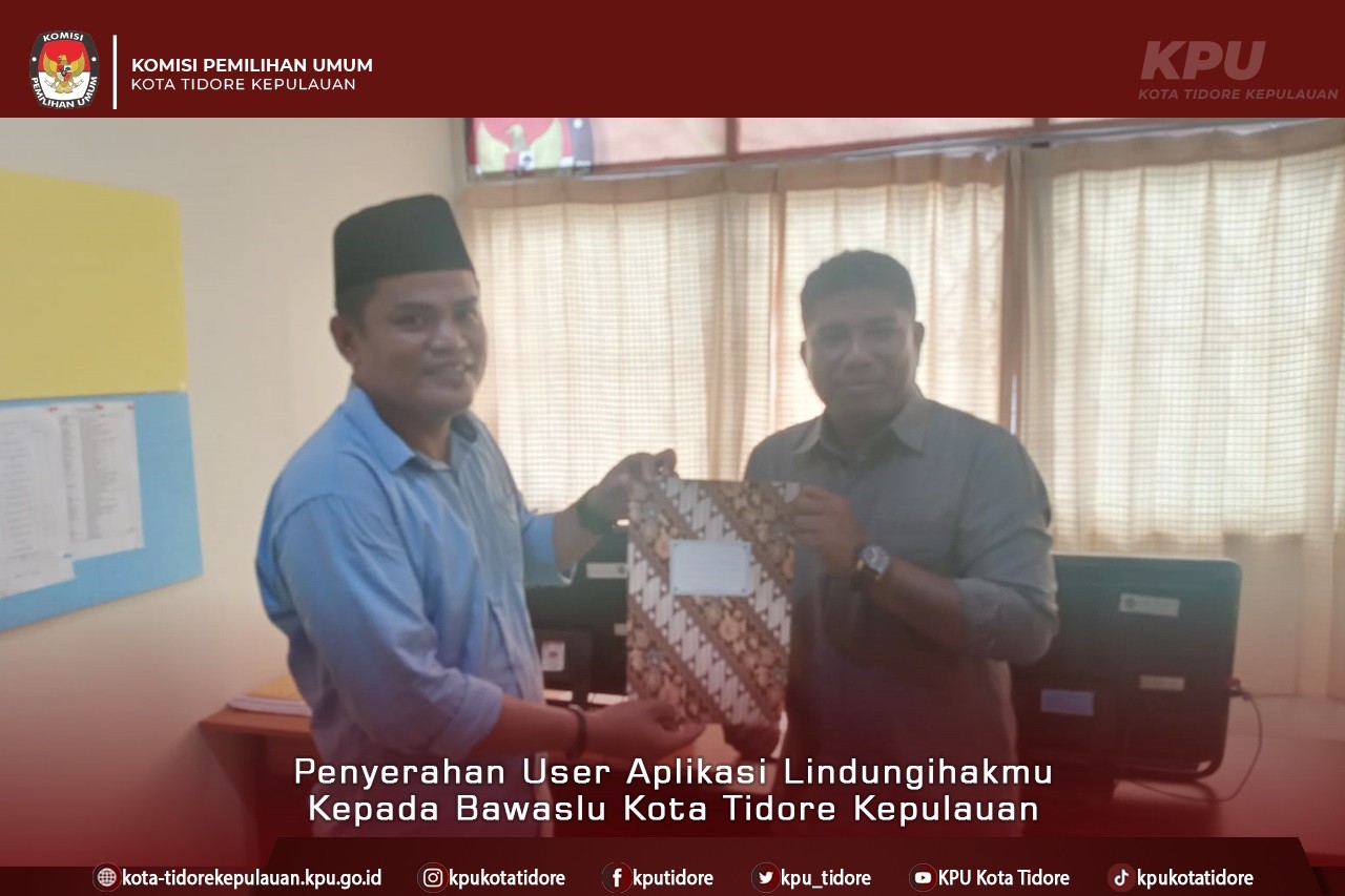 #TemanPemilih, KPU Kota Tidore Kepulauan Selasa (2/8/2022). KPU Kota Tidore Kepulauan menyerahkan User aplikasi lindungihakmu kepada Bawaslu Kota Tidore Kepulauan. Aplikasi Lindungihakmu merupakan salah satu aplikasi yang diluncurkan oleh KPU RI pada Rabu, 13 Februari, sejalan dengan semangat Undang-Undang Nomor 7 Tahun 2017 tentang Pemilihan Umum (Pemilu) serta tindak lanjut dari Peraturan KPU (PKPU) Nomor 6 Tahun 2021 tentang Pemutakhiran Data Berkelanjutan serta surat edaran KPU nomor 18 tentang aplikasi Lindungihakmu. Selain sebagai alat untuk memudahkan pemilih untuk mengecek data pemilih juga dapat digunakan sebagai media monitoring oleh Bawaslu sebagai lembaga pengawasan. Bawaslu dapat mengetahui data pemilih di Kota Tidore Kepulauan melalui aplikasi ini. Penyerahan User sendiri diserahkan oleh Amirudin Ais, sebagai Kordinator devisi perencanaan data dan informasi kepada pimpinan Bawaslu Kota Tidore Kepulauan Bapak Amru Arfa, bertempat di Kantor KPU Kota Tidore Kepulauan.