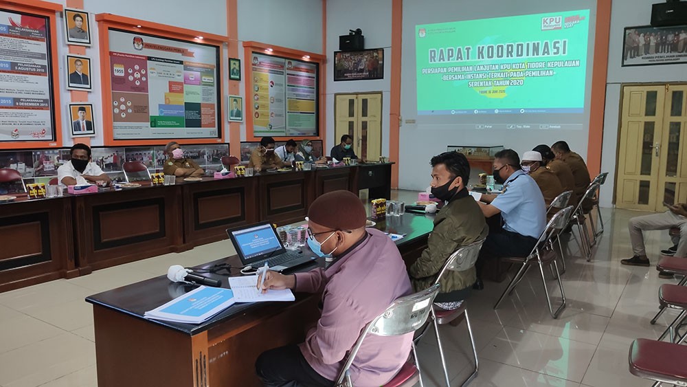 Komisi Pemilihan Umum (KPU) Kota Tidore menggelar rapat koordinasi dengan sejumlah stakeholder guna membahas tahapan pemilihan Wali Kota dan Wakil Wali Kota Tidore Kepulauan 2020 di aula kantor KPU Tidore, Selasa 16 Juni 2020.