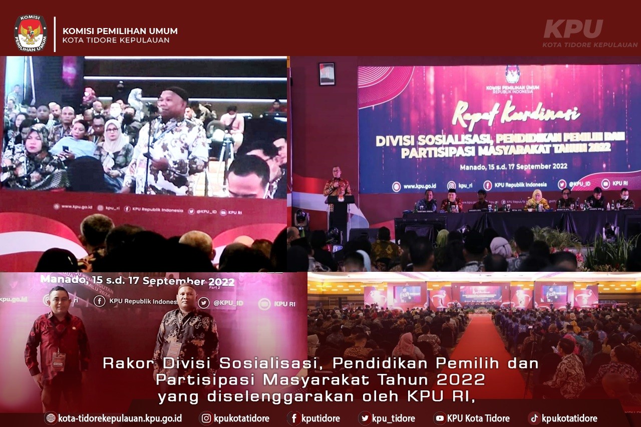 #TemanPemilih, KPU Kota Tidore Kepulauan menghadiri Rapat Koordinasi (Rakor) Divisi Sosialisasi, Pendidikan Pemilih dan Partisipasi Masyarakat Tahun 2022 yang diselenggarakan oleh KPU RI, berlangsung dari tanggal 15 - 17 September 2022 di Manado