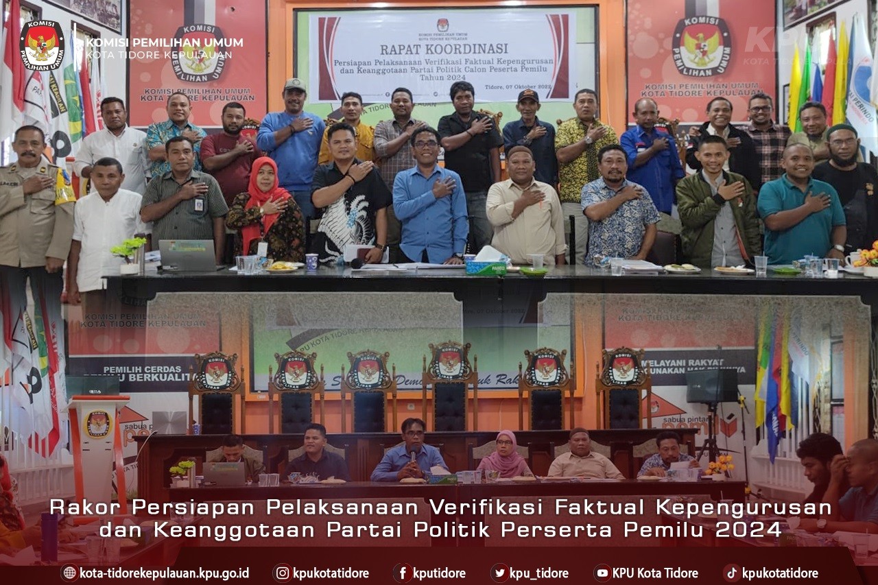 #Temanpemilih, KPU Kota Tidore Kepulauan, Jumat (7/10/2022), menyelenggarakan Rapat Koordinasi (Rakor) Persiapan Verifikasi Faktual Kepengurusan dan Keanggotaan Partai Politik Tahun 2024, bertempat di Aula Kantor KPU Kota Tidore Kepulauan.