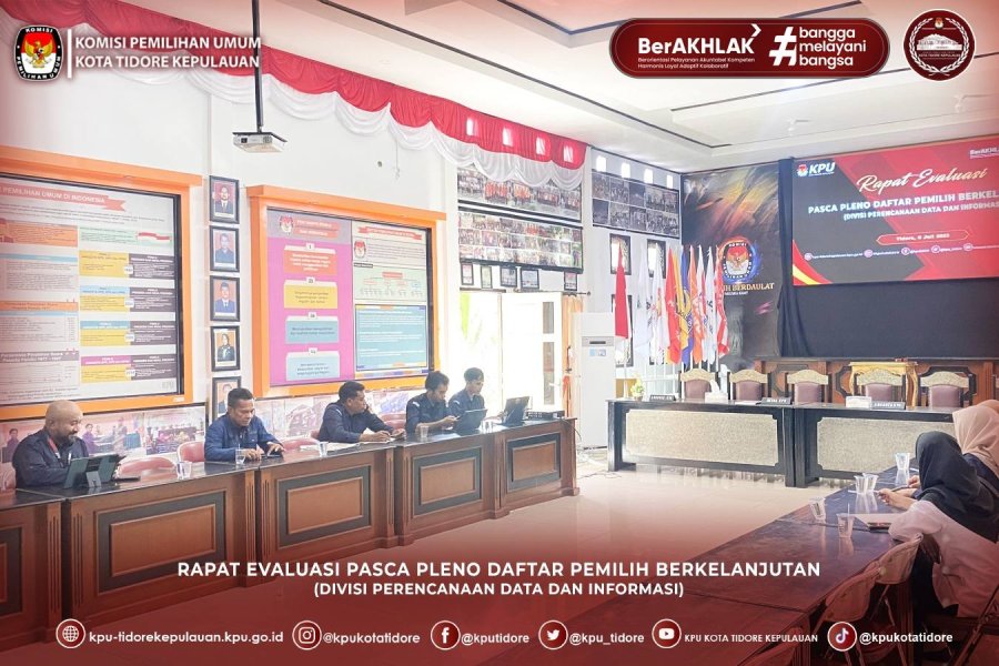 #TemanPemilih, KPU Kota Tidore Kepulauan menyelenggarakan rapat evaluasi pasca pleno daftar pemilih berkelanjutan yang bertempat di aula rapat KPU Kota Tidore Kepulauan pada Selasa 8 Juli 2025. Rapat ini dibuka oleh kasubbag Perencanaan Data dan Informasi Zulfah Badriyah beserta seluruh staf perencanaan, data dan informasi KPU Kota Tidore Kepulauan dan dihadiri via Zoom oleh kadiv Perencanaan, Data Dan Informasi Sudirman Ismail. Dalam arahannya Zulfah Menyampaikan bahwa rapat evaluasi ini penting untuk mengatasi kekurangan pada rapat pleno PDPB Triwulan II sehingga bisa diminimalisir pada tahapan rapat pleno PDPB Triwulan III, sementara itu Kadiv Perencanaan, Data dan Informasi Sudirman Ismail menegaskan bahwa hasil dari rapat evaluasi ini merupakan tanggung jawab seluruh staf untuk menindaklanjuti. Rapat ditutup oleh pimpinan rapat pada pukul 10.30 WIT.