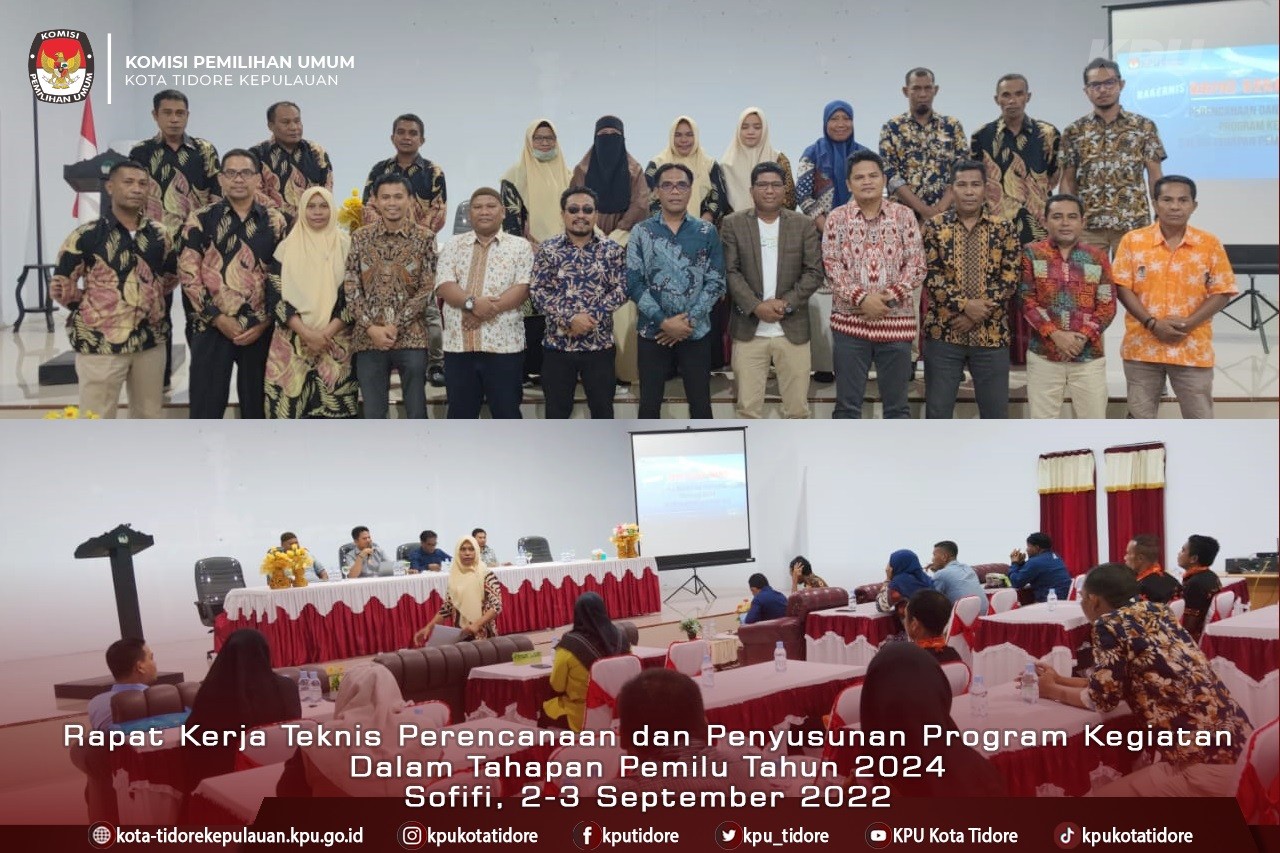 #TemanPemilih, KPU Kota Tidore Kepulauan menggelar Rapat Kerja Teknis (Rakernis) Perencanaan dan Penyusunan Program Kegiatan dalam Tahapan Pemilu 2024. Rakernis ini bertujuan agar satuan kerja KPU Kota Tidore mampu mendetailkan serta menyusun program kegiatan dalam tahapan pemilu tahun 2024.