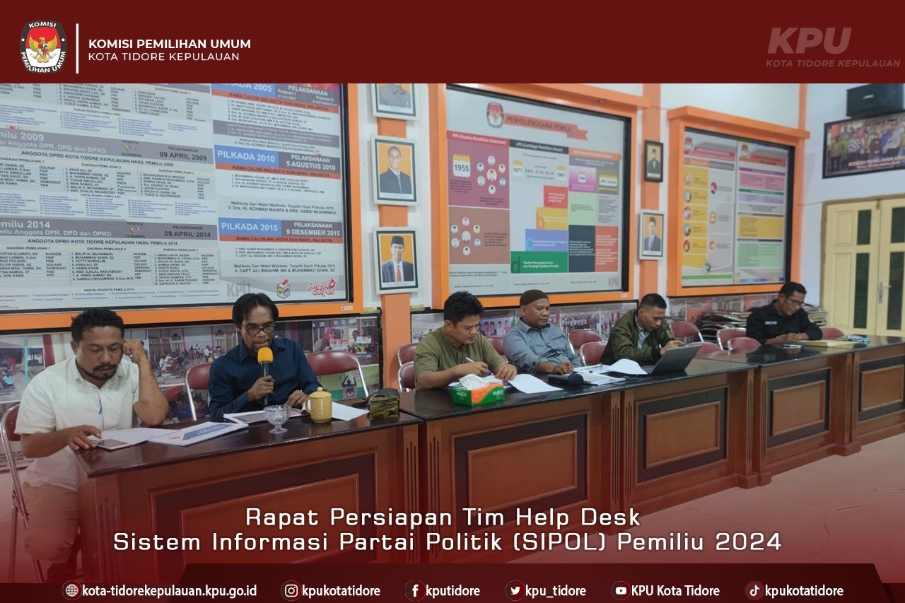 Rapat dihadiri Ketua KPU Kota Tidore Kepulauan Abdullah Dahlan dan anggota Amirudin Ais, Abdulharis Doa, Abjan Kasim, dan Ismail Idris, Sekretaris Akmal Daud serta Tim Helpdesk. Rapat yang bertempat di aula kantor ini dipimpin langsung ketua tim helpdesk Asman H. Muhammad.