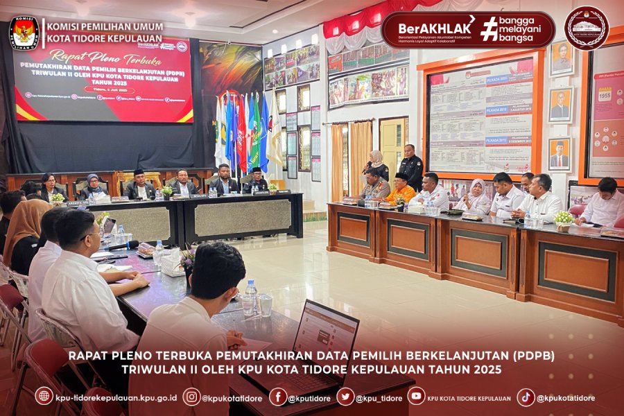 #TemanPemilih, KPU Kota Tidore Kepulauan menyelenggarakan rapat Pleno terbuka pemuktahiran data pemilih berkelanjutan (PDPB) triwulan II di aula KPU Kota Tidore Kepulauan pada rabu 2 Juli 2025. Ketua KPU Kota Tidore Kepulauan Randi Ridwan didampingi Anggota Bahrudin Tosofu, AbdulHaris Doa, Sudirman Ismail, dan Fitriah Hi. Muhammad, Sekretaris Akmad Daud, Kassubag Hukum dan SDM Alwia M. Saleh, Kasubag Perencanaan Data dan Informasi Zulfah Badriyah dan Kassubag Teknis Sosdiklih dan Parmas Asman Hi. Muhamad dan seluruh staf Sekertariat KPU Kota Tidore Kepulauan. Turut hadir Perwakilan Bawaslu Kota Tidore Kepulauan, Polres Kota Tidore Kepulauan, Dinas Kependudukan dan Pencatatan Sipil, Rutan kelas IIB Soasio, Kemenag Kota Tidore Kepulauan, dan BPS Kota Tidore Kepulauan.