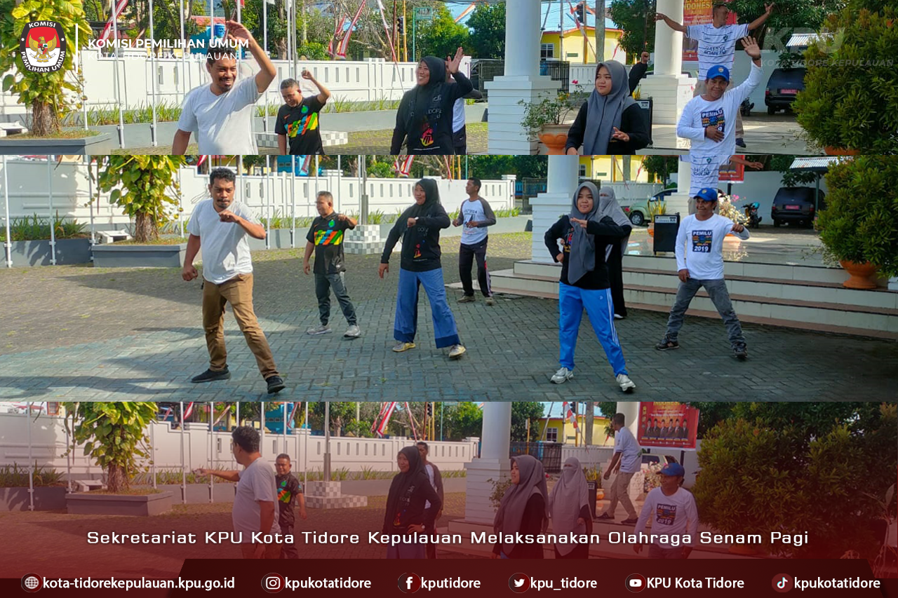 #TemanPemilih, Sekretariat KPU Kota Tidore Kepulauan melaksanakan olahraga senam pagi di halaman kantor, Ju'mat (25/8/2023).Kegiatan ini dilakukan berdasarkan surat edaran Sekretaris Jenderal KPU RI nomor 2963/SDM.07.1-SD/04/2023 tertanggal 8 Agustus 2023 tentang pelaksanaan olahraga di hari Ju'mat.