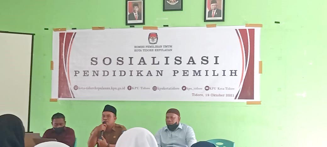 Komisi Pemilihan Umum (KPU) Kota Tidore Kepulauan, Selasa (19/10/2021) melaksanakan Kegiatan Sosialisasi Pendidikan Pemilih di SMK Negeri 3 Tidore Kepulauan yang berlokasi di Kelurahan Dowora Kecamatan Tidore Timur. Hadir sebagai narasumber dari KPU Kota Tidore Kepulauan Ketua Divisi Sosodiklih Parmas dan SDM Dr. Abjan Kasim,S.Pd,MAP didampingi Ketua Divisi Hukum dan Pengawasan Ismail Idris,SH, turut hadir Kepala SMKN 3 Tidore Kepuauan Ahmad Usman, S.Pd memberikan sambutan. Peserta yang mengikuti kegiatan sebanyak 25 orang yang terdiri dari siswa/siswi kelas I, II dan III. Dalam pemamparan materinya Abjan Kasim menyampaikan pentingnya partisipasi pemilih dalam pemilu dan pemilihan, sementara Ismail Idris lebih menekankan pada aspek pencegahan politik uang dan berita hoaks. Acara ditutup dengan pemberian sertifikat penghargaan kepada peserta. Sosialisasi pendidikan pemilih di SMK Negeri 3 ini merupakan lokasi kegiatan pertama yang didatangi KPU Kota Tidore Kepulauan dari enam lokasi yang direncanakan, lima lokasi lainnya adalah Univerisas Nuku Tidore, Kelurahan Tomalou, SMA Negeri 8 Tidore Kepulauan, Universitas Bumi Hijrah dan Desa Somahode.