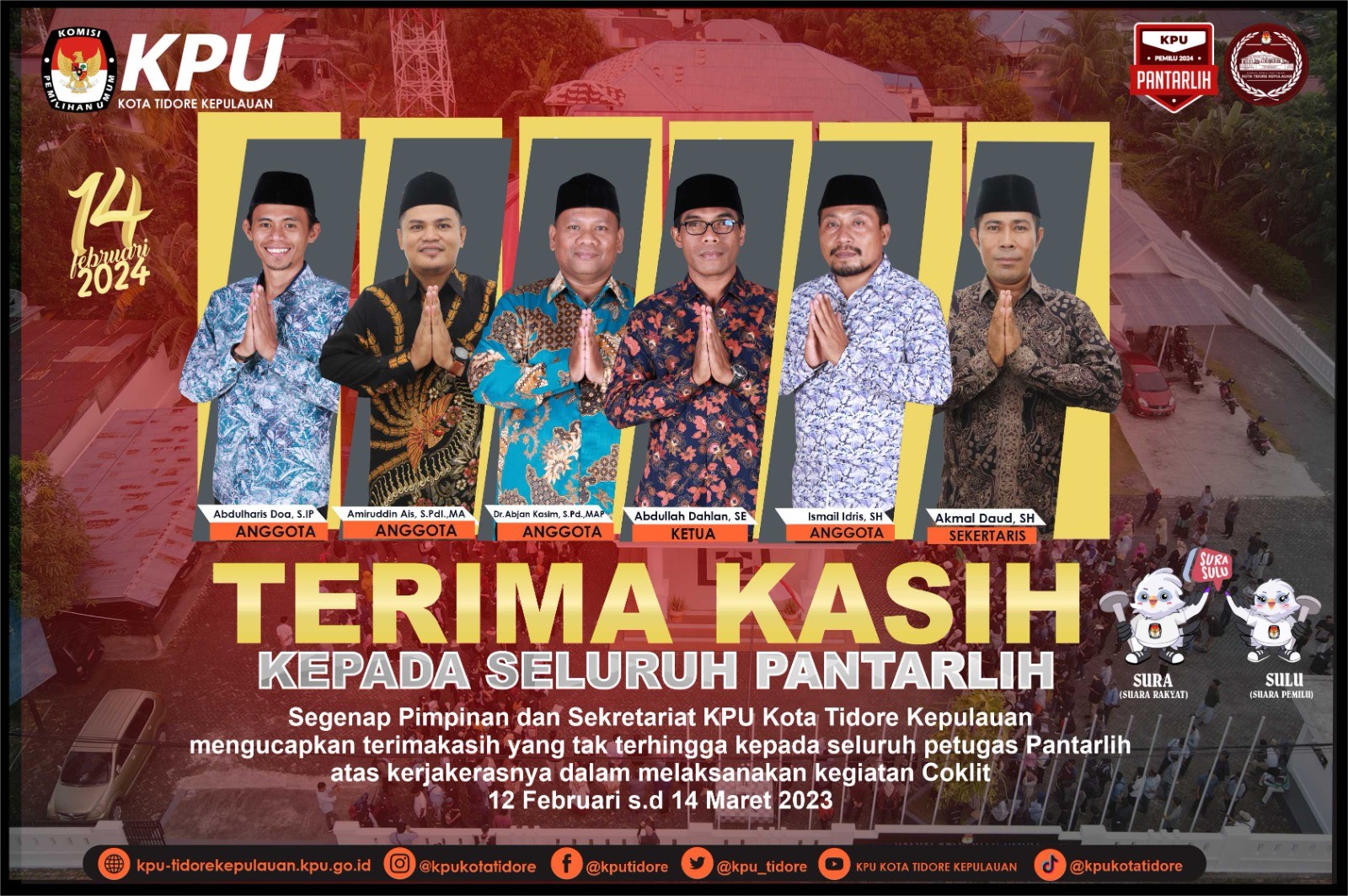 Dan juga ucapan terimakasih kepada seluruh masyarakat Kota Tidore Kepulauan yang telah berpartisipasi aktif dalam memberikan data, Instansi terkait dan Bawaslu Kota Tidore Kepulauan yang telah mengawal dan menyukseskan tahapan coklit ini.