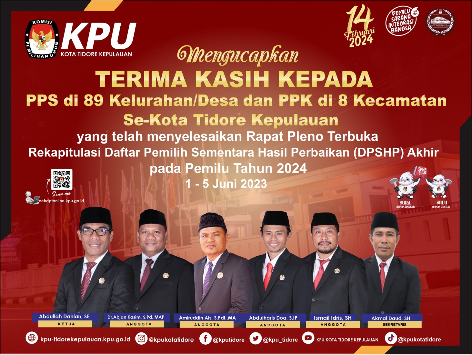 #TemanPemilih, Komisi Pemilihan Umum Kota Tidore Kepulauan mengucapkan terimakasih kepada PPS di 89 Kelurahan/Desa dan PPK di 8 Kecamatan se-Kota Tidore Kepulauan. Yang telah menyelesaikan Rapat Pleno Terbuka Rekapitulasi Daftar Pemilih Sementara Hasil Perbaikan (DPSHP) Akhir pada Pemilu Tahun 2024.